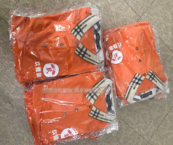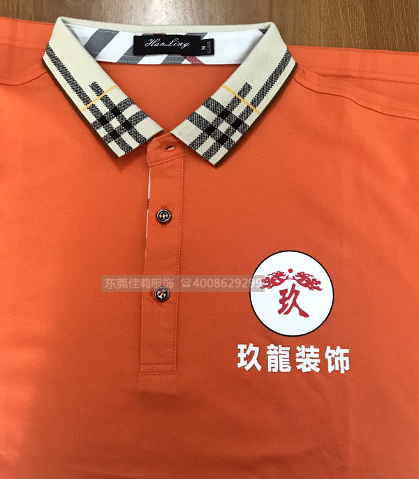 玖龍裝飾的吳總是通過老客戶介紹認(rèn)識(shí)的,因?yàn)槭亲鲅b飾行業(yè),所以對(duì)夏季工作服的要求,是吸汗透氣,而且形象亮眼,給人一種時(shí)尚低調(diào)有內(nèi)涵的感覺。吳總選中了一款橙色T恤衫,非常感謝吳總的理解,雖然延遲了交貨日期,但還是非常順利交貨了。