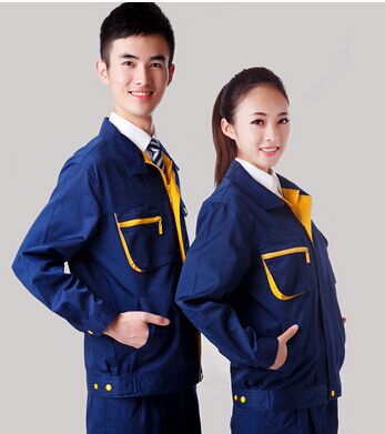 JL-QD249東莞工作服 以深藍色為主色,胸前采用黃色搭配,醒目,工業感強。前兜撞色拼接,走線細致,實用性強。左中腰間口袋均采用雙層設計,傾斜線條,穩重大氣