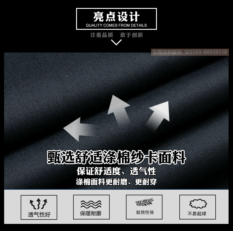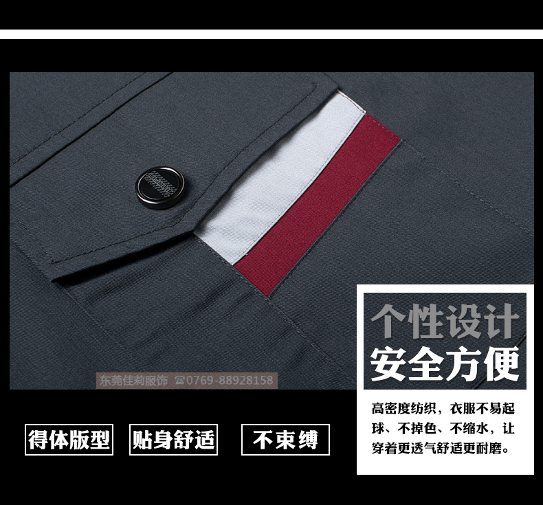 高品質全新形象,經典設計,立體裁剪,時尚翻領,質感有型。走線細致,優質暗扣,實用性強。胸前口袋撞色拼接,雙明線縫制既時尚又耐用,即使在下班之余也可以穿。