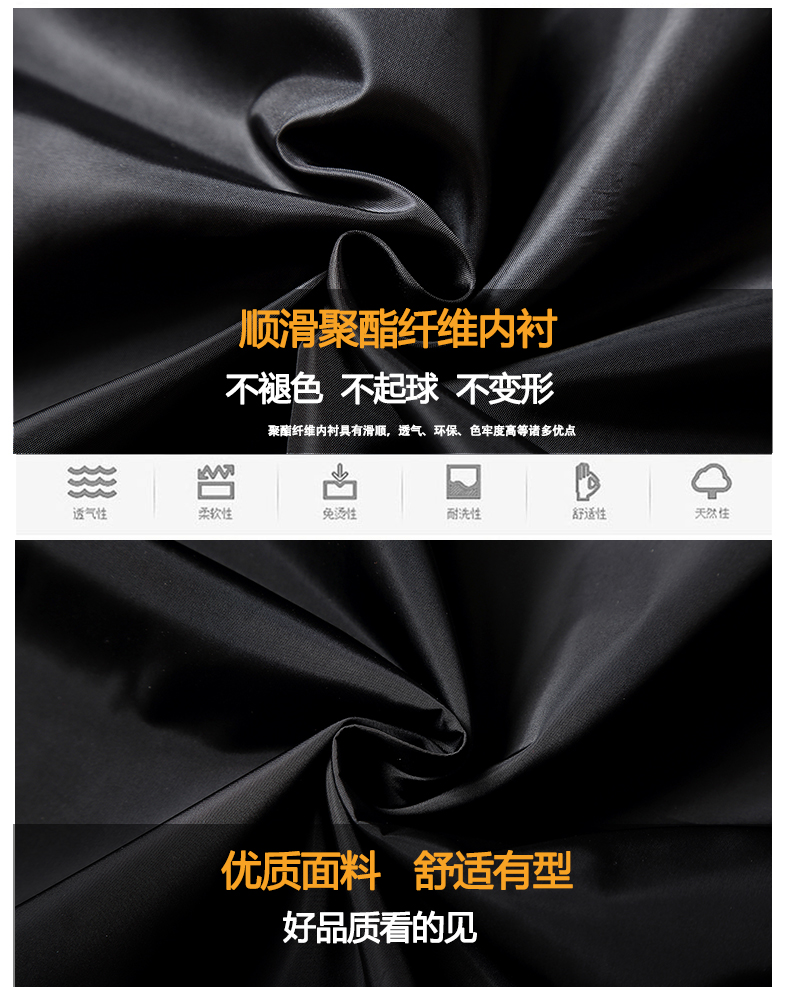 采用超順滑聚酯纖維內襯,不起球,不褪色,不變形。防靜電內襯,為冬天起到更實用的穿著